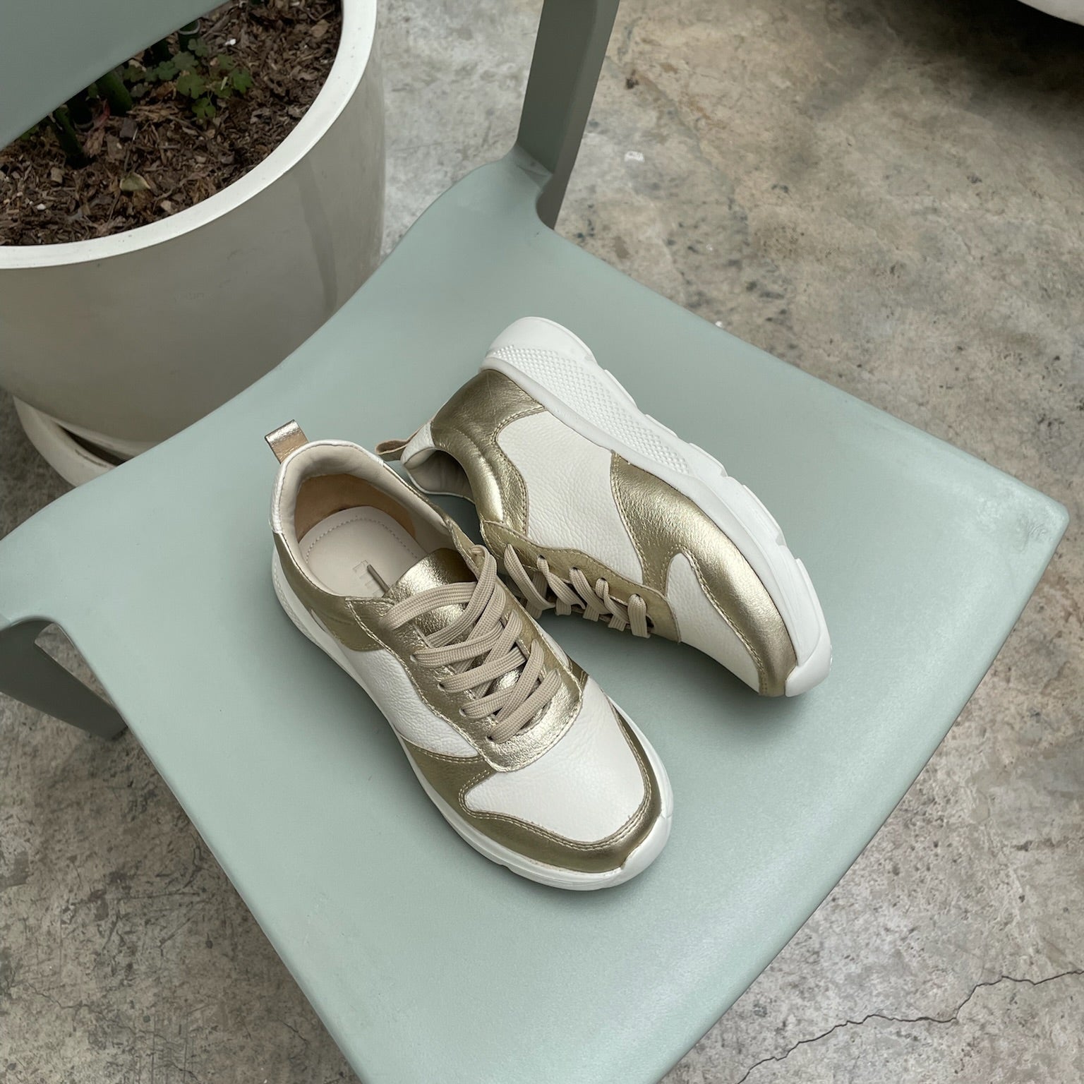 Un diseño versátil y chic que combina el brillo sutil del dorado con la frescura del blanco. Hechas en 100% cuero, son transpirables, cómodas y perfectas para acompañarte en cualquier plan del día a la noche. Ideales para darle un toque moderno y elegante a tus looks sin perder comodidad.